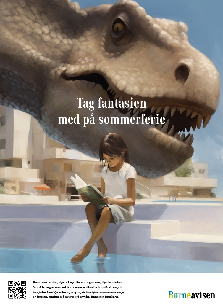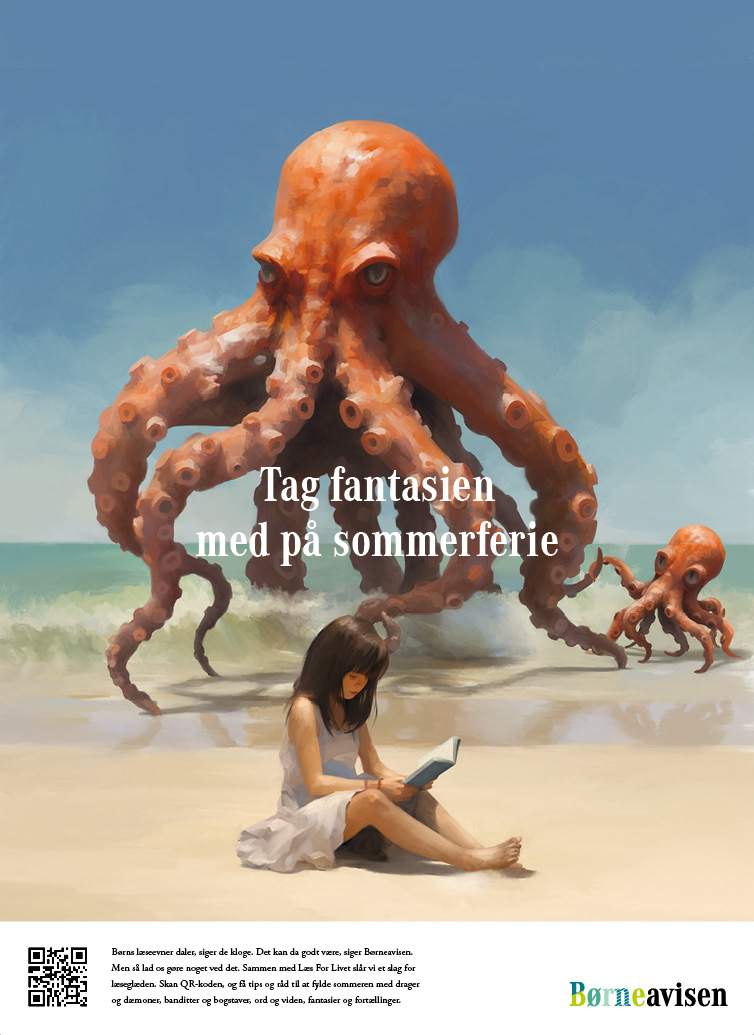 Hvad stiller man op med børns dalende læselyst og ditto evner? Børneavisen besluttede sig for at slå et slag for læseglæden og bad os udvikle en kampagne, der kunne inspirere forældre til at bruge sommerferien på at læse med deres børn. Henover sommeren foldede vi fantasiens faner ud på billboards, i avisannoncer og på online-medier. Vi skabte et håndtegnet sommerland befolket af kæmpeblæksprutter, drager, dinosaurer og robotter - det hele leveret i en tegnestil, der sendte venlige hilsner til børnebøger fra forældrenes barndom.