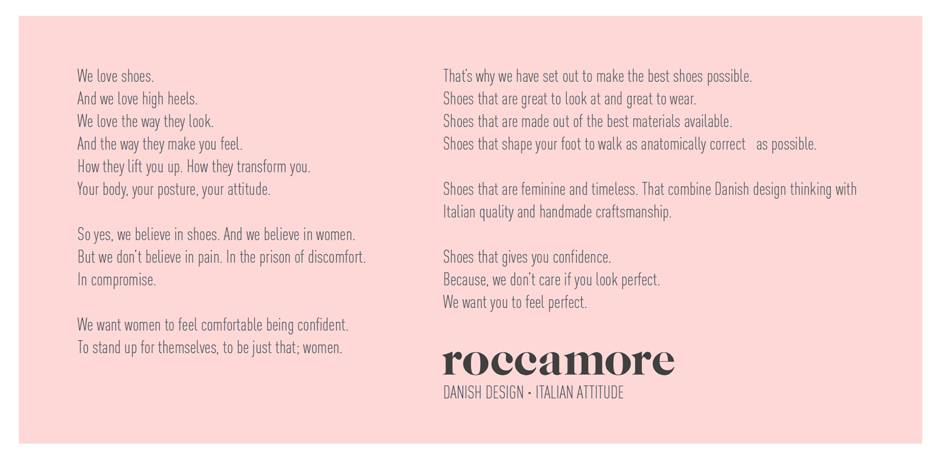 For the Danish shoebrand, Roccamore, I developed their brand platform